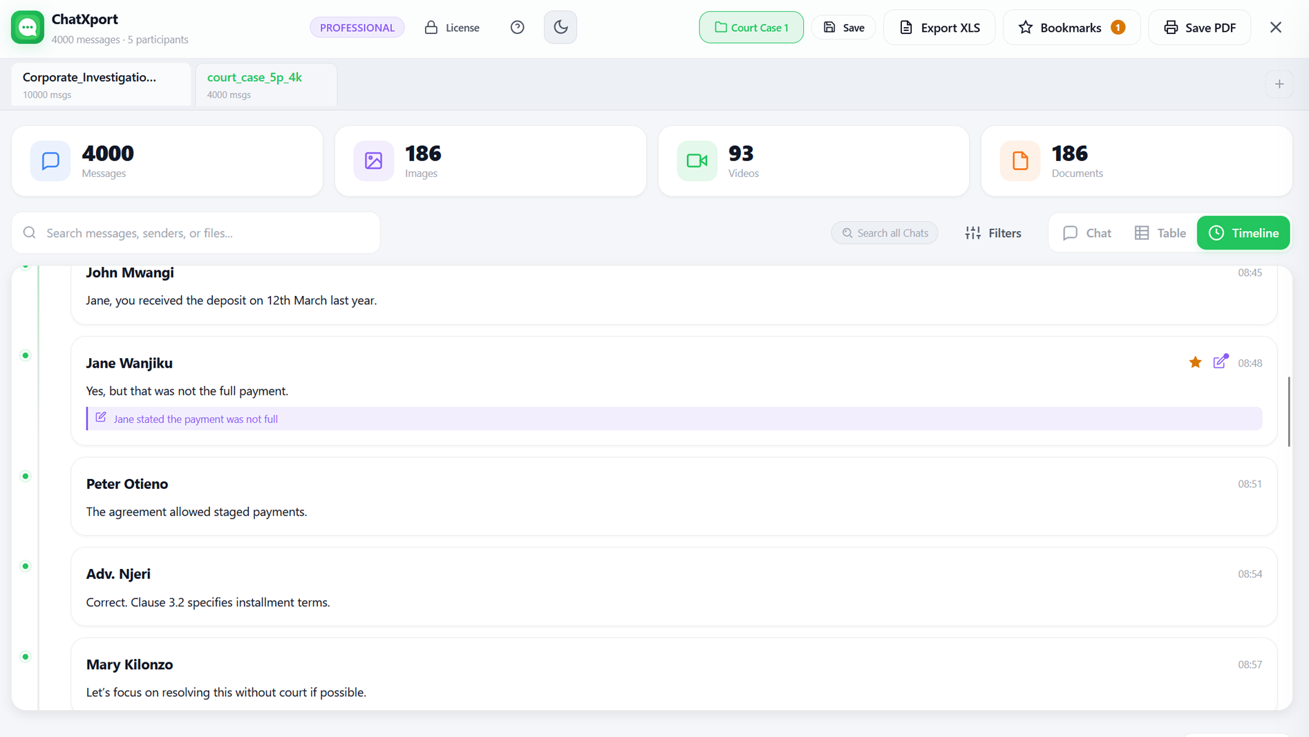 ChatXport organizes exported chats into a clean conversation layout with participants, timestamps, and media in the correct context. It also adds fast search, filters, bookmarks, and structured exports like PDF and Excel so large chats become easier to review, analyse, or share.