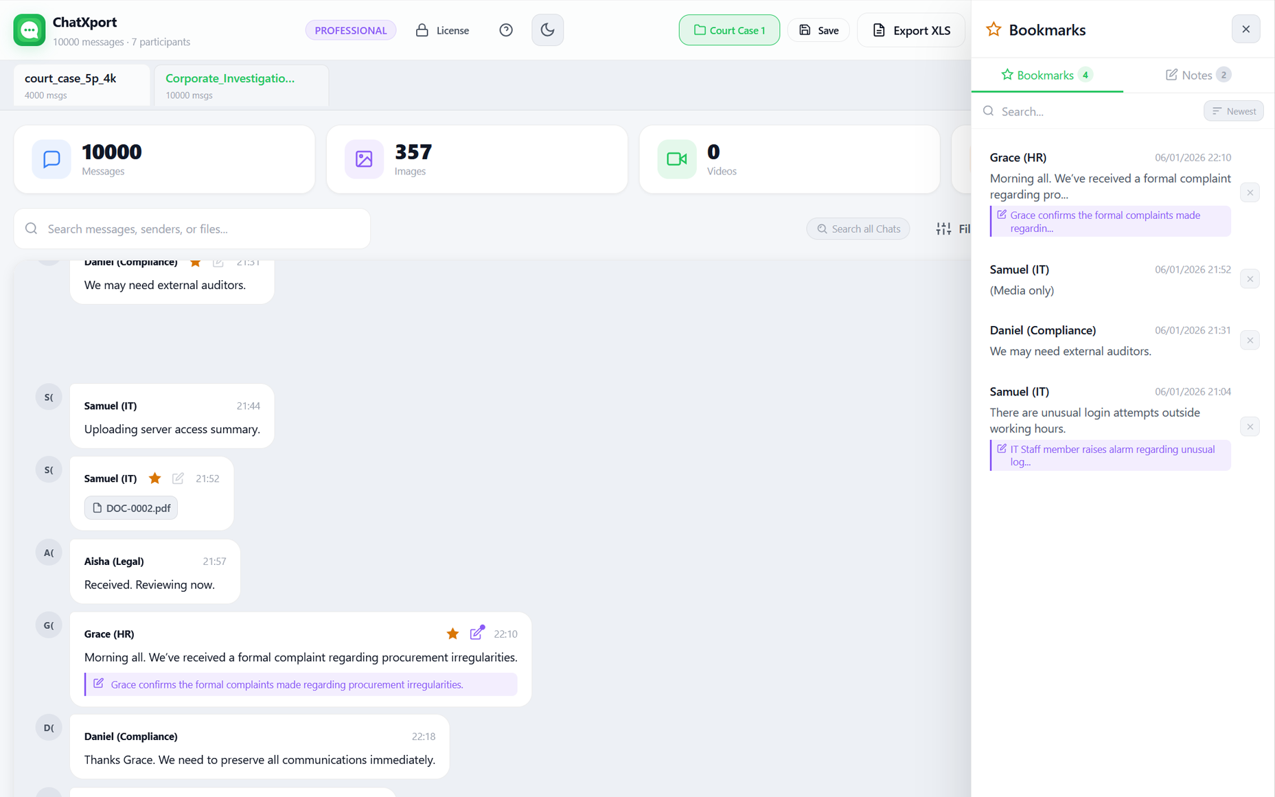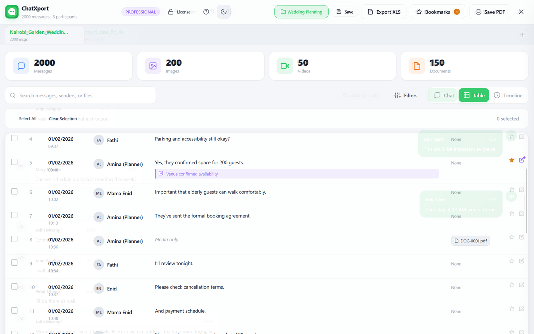 ChatXport organizes exported chats into a clean conversation layout with participants, timestamps, and media in the correct context. It also adds fast search, filters, bookmarks, and structured exports like PDF and Excel so large chats become easier to review, analyse, or share.